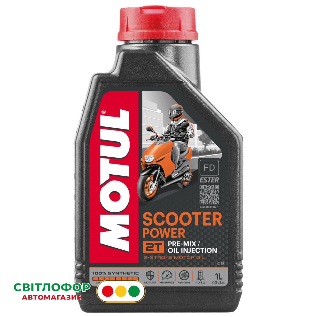 100% синтетичний мастильний матеріал, створений за технологією Ester, спеціально розроблений для потужних 2-тактних двигунів скутерів, які працюють при підвищених обертах. Стійка оливна плівка забезпечує покращений захист від зношування. Дозволяє отримати від двигуна повну потужність, мінімізує коефіцієнт тертя. Запобігає утворенню відкладень і зберігає двигун чистим: камеру згорання, поршні, випускні отвори, поршневі канавки, випускні колектори тощо. Мінімізує димність.