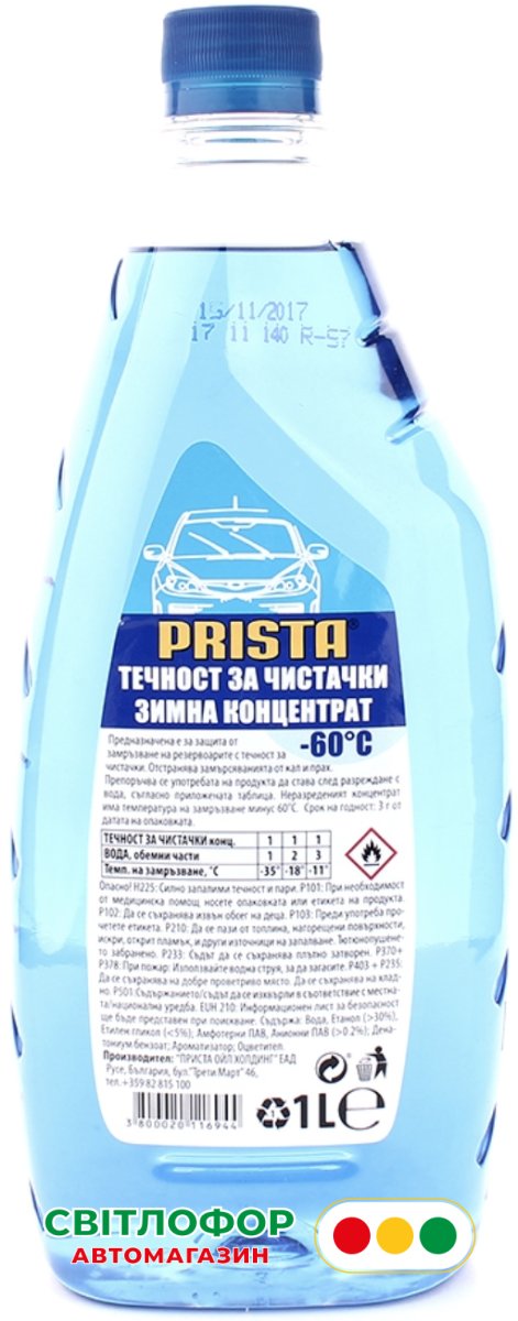 Зимовий омивач скла-концентрат Prista Winter Screen Wash -60°C в своєму складі містить надійні антифризні і очищающі елементи, гарантує надійну очистку. Даний омивач ефективно справляється з видаленням різних забруднень, таких як дорожній наліт, масляні плями, бруд і т.д. Омивач сумісний з лакофарбовим покриттям авто, гумовими елементами, не завдає шкоди їх структурі, а тільки лише ефективно очищає. Завдяки своїй компактній формі засіб може з легкістю поміститься в будь-якому зручному місці авто, але його наявність необхідна для своєчасної якісної і надійної очистки. У процесі використання засіб не залишає розводів, володіє хорошим ароматом. Також омивач сприяє захисту від пошкодження щіток склоочисника і вітрового скла. Даний засіб омивач-концентрат, тому перед заливкою в бачок склоомивача його потрібно розвести за допомогою дистильованої води. Пропорції залежать від температурних умов, при яких буде застосовуватися омиваюча рідина.