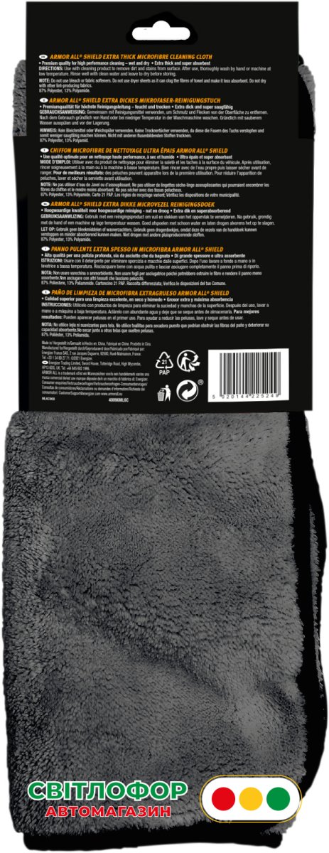 Надзвичайно товста тканина з мікроволокна Armor All Shield ідеально підходить як для вологого, так і для сухого прибирання. Тканина преміум-класу чудово поглинає вологу та допомагає легко і якісно очистити поверхню. Підходить для повного використання в автомобілі, всередині та зовні, а також для різноманітного домашнього використання. Намочіть тканину, щоб зробити ваш автомобіль блискучим, або використовуйте її сухою, щоб зменшити розмазування.
